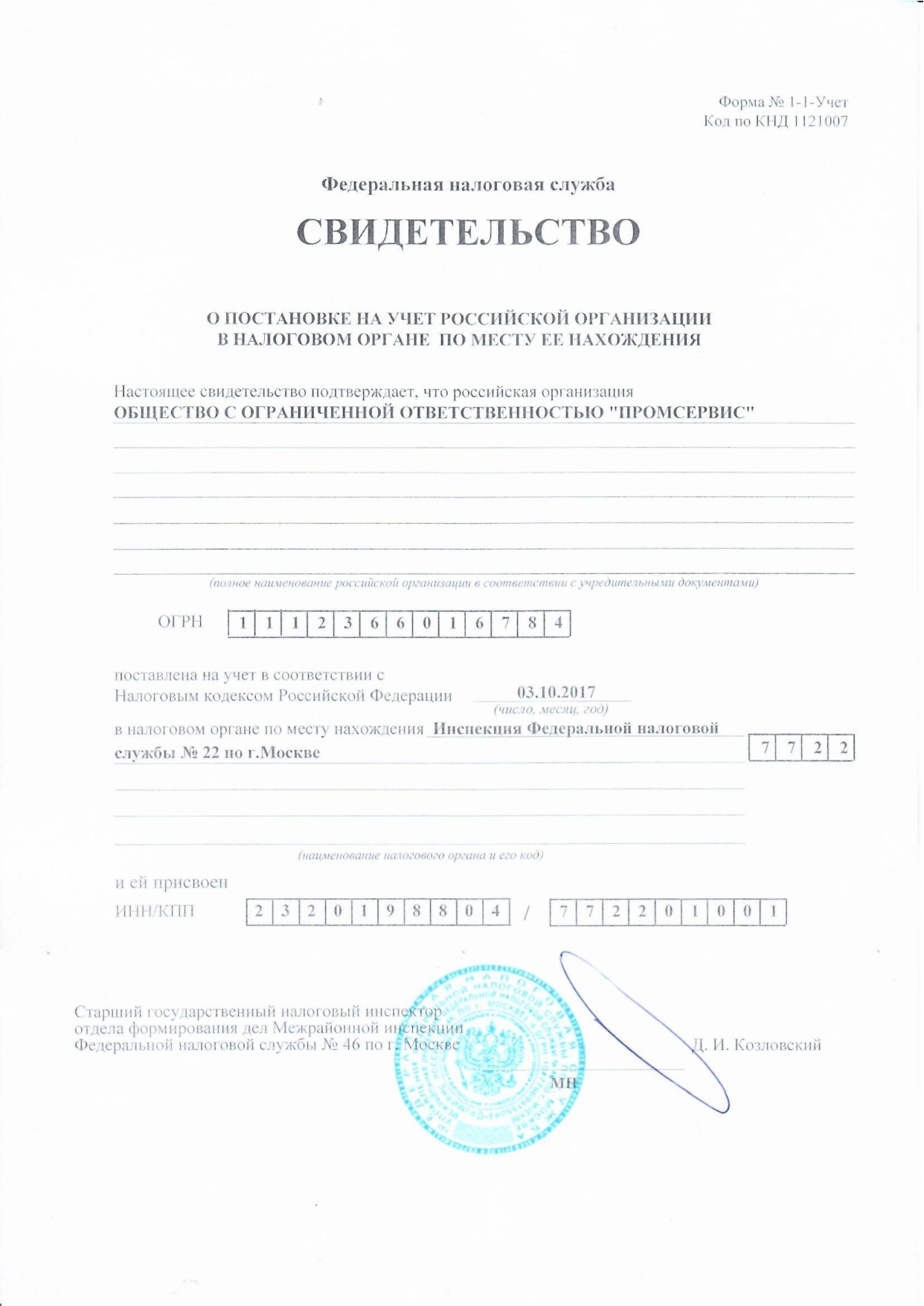 свидетельство о постановке на учет российской организации в налоговом органе по месту ее нахождения